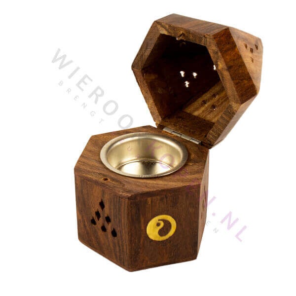 Houten handgesneden kegelhouder in piramide vorm. De houder heeft aan 2 zijden emessing inleg Yin-Yang symbool en een metalen schaaltje waar je de kegels veilig in kunt branden.