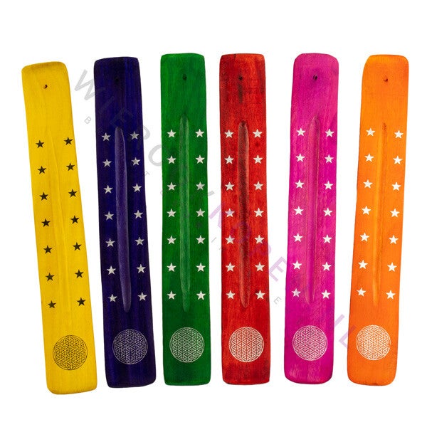 Houten plankje met Levensbloem symbool. Geschikt voor het branden van dunnere wierookstokjes, zoals Satya wierook, Golden Nag wierook, HEM wierook, Yoga wierook, Agarbatti en Masala wierook.