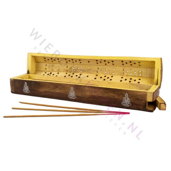 Houten handgesneden wierookhouder met Boeddha opdruk. Is tevens bewaardoos voor een pakje wierookstokjes. De aromatische dampen komen bij het sluiten van de wierookhouder in sfeervolle stromen door de gaatjes in de deksel.