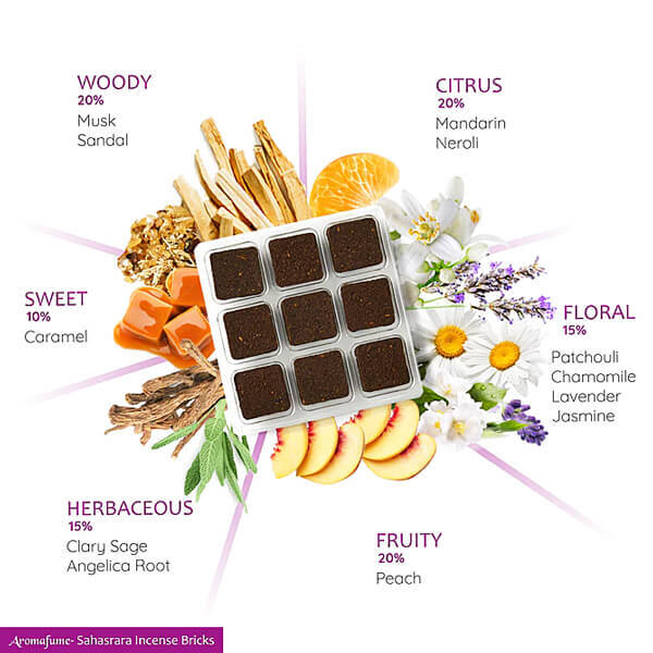 Gemengd door een Chakra Alignment Herb Master, hebben de Sahasrara wierookblokjes van Aromafume een delicaat uitgebalanceerde geur, die bestaat uit diverse pure aromatische extracten.